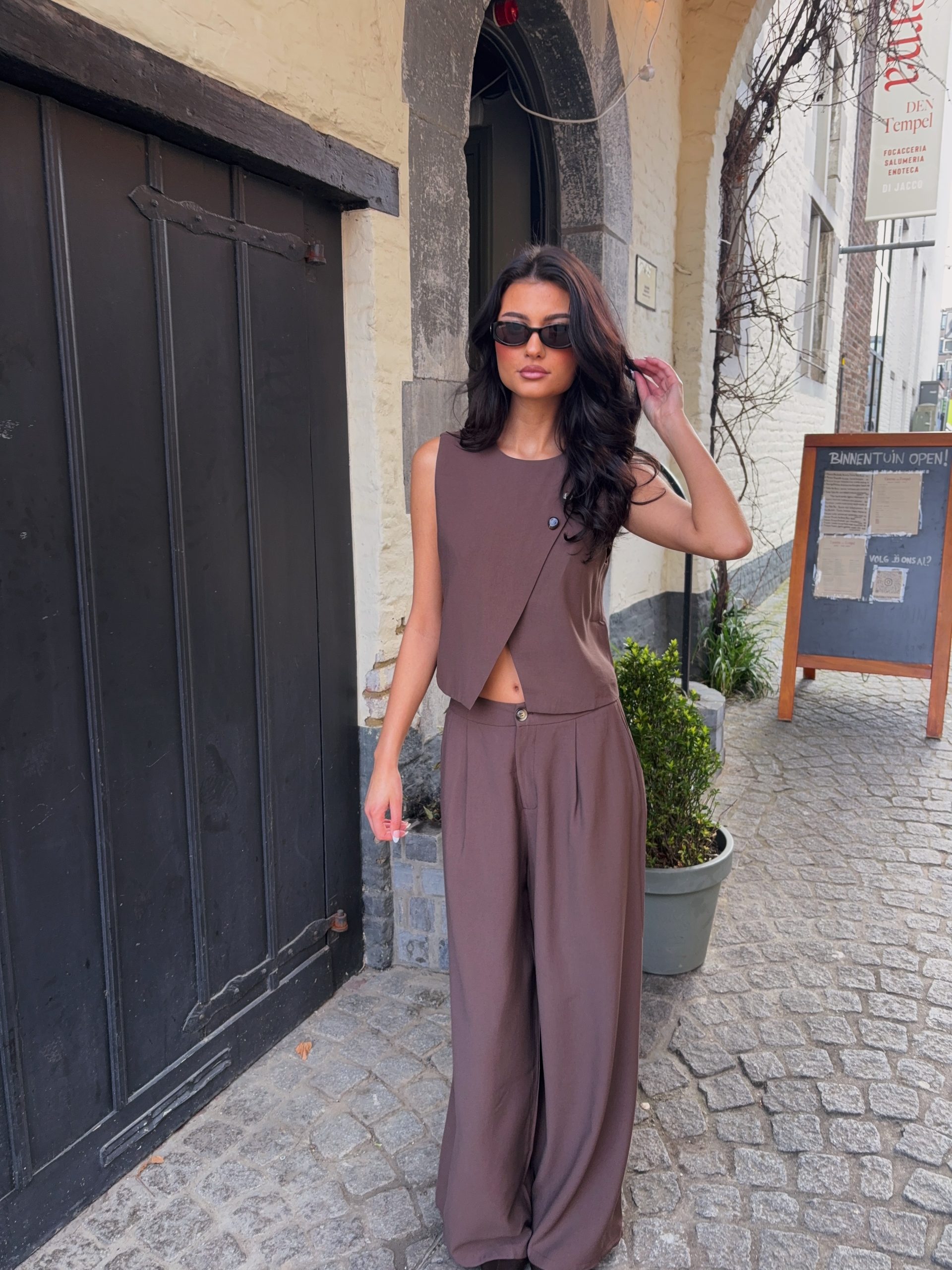 Een stijlvol bruine setje met een zachte en tijdloze uitstraling. De neutrale kleur zorgt voor een elegante en minimalistische look, terwijl de pasvorm het perfect maakt voor zowel een casual dag als een nette gelegenheid. Makkelijk te combineren met andere items voor een complete en moderne outfit. ons model is 173cm en draagt een s.