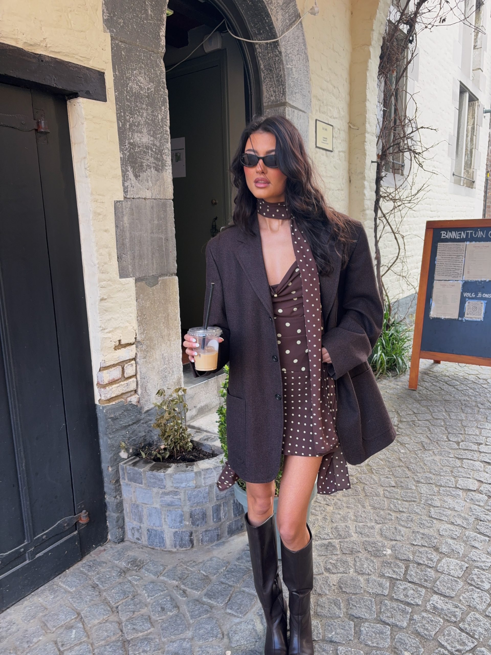 Speels bruin jurkje met een subtiele lichte polkadots print voor een tijdloze en vrouwelijke look. De lichte stippen geven het jurkje een frisse uitstraling, terwijl de comfortabele stof zorgt voor een fijne pasvorm. Perfect voor zowel casual als iets nettere outfits. Ons model is 173cm en draagt een s.