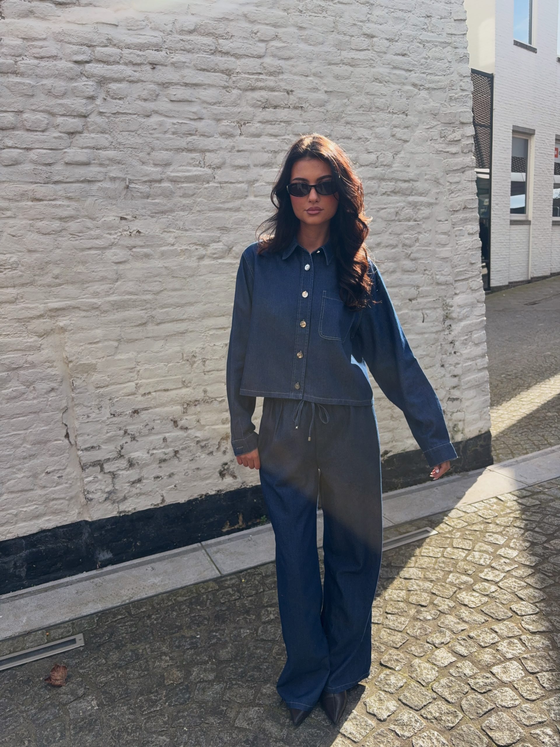 Een stijlvolle set van donker denim die zorgt voor een tijdloze en stoere uitstraling. De set combineert een perfecte pasvorm met een moderne look en is gemakkelijk zowel casual als iets chiquer te dragen. Ideaal om samen te dragen als complete outfit of los te combineren met andere items. Ons model is 1,73 m lang en draagt maat S/m