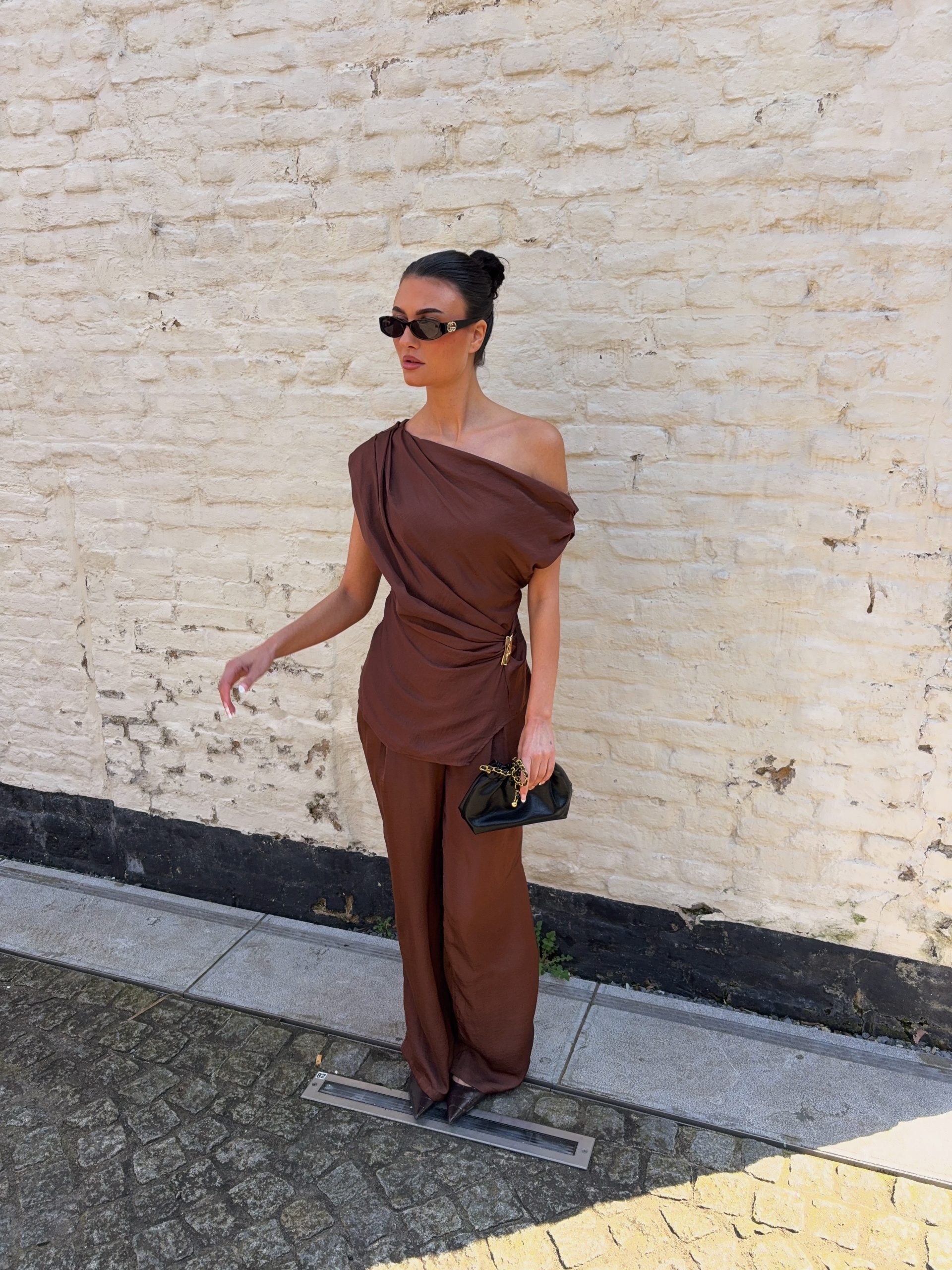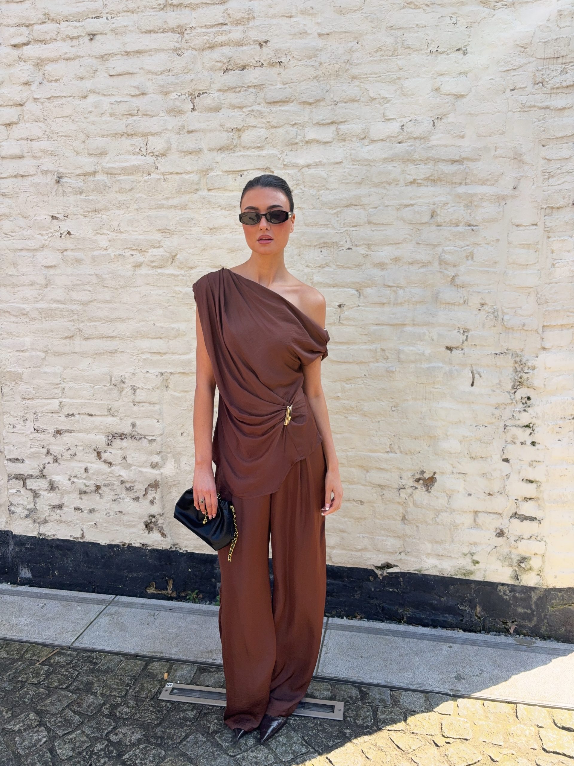 Deze prachtige 2-delige set straalt pure elegantie uit. De top heeft een stijlvolle asymmetrische pasvorm met een speels gedrapeerd effect, wat zorgt voor een vrouwelijke en chique uitstraling. De bijpassende broek valt soepel langs het lichaam en geeft een luxe, effortless look.